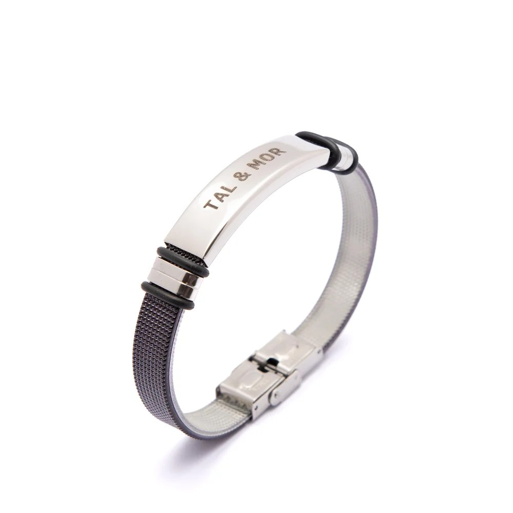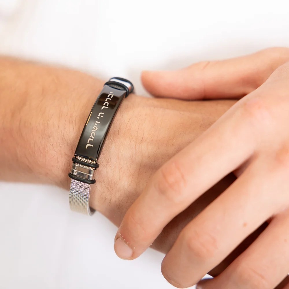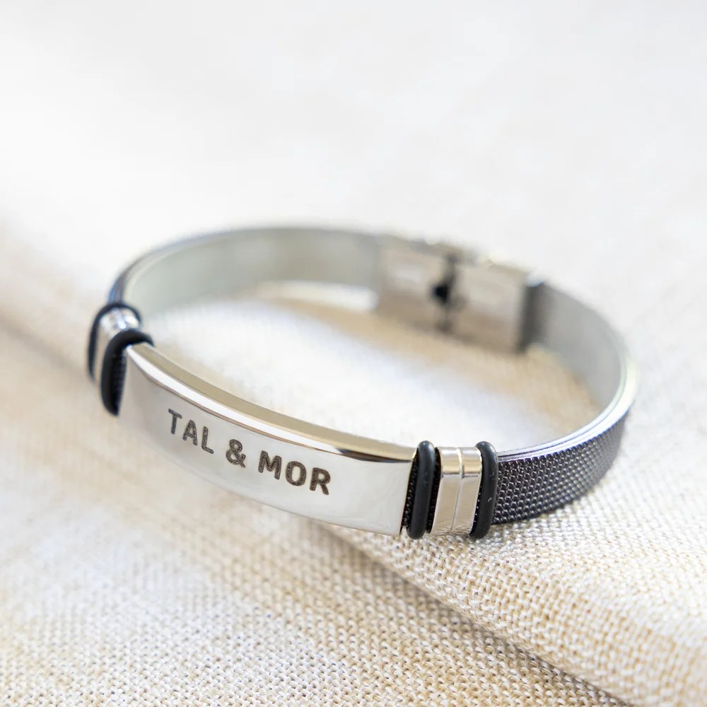 אנו מציגים את הצמיד המדהים שלנו לגברים עם באפשרויות מתכת שחורה אלגנטית או כסף יוקרתי, מושלם לחריטה אישית.